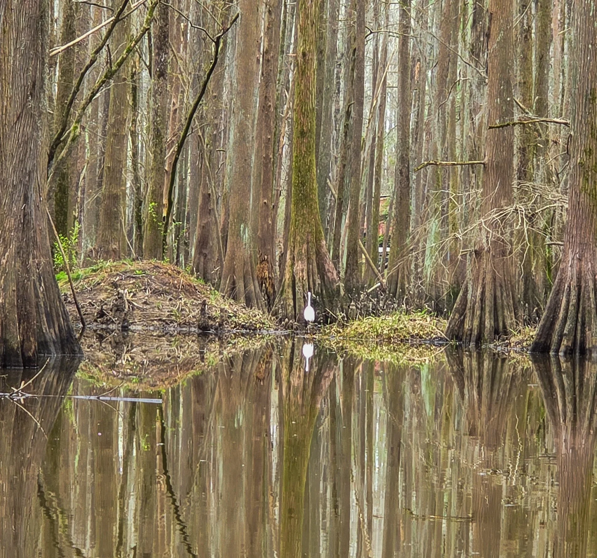 We took the less-traveled route west from the park on the Big Cypress Bayou and into the Haggerty Creek Paddling Trail—a labyrinth of trees. Our egret tour guide kept us company, popping up repeatedly along the way.