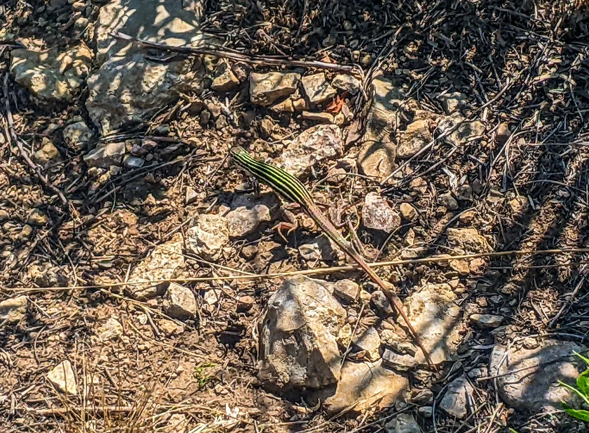 We also saw a few deer on our route, but they pranced by too quickly for a picture. We also encounter a cool-looking, striped lizard, probably a male six-lined racerunner. (They are the fastest lizards in North America, which explains why it was difficult to get a good picture of him!)